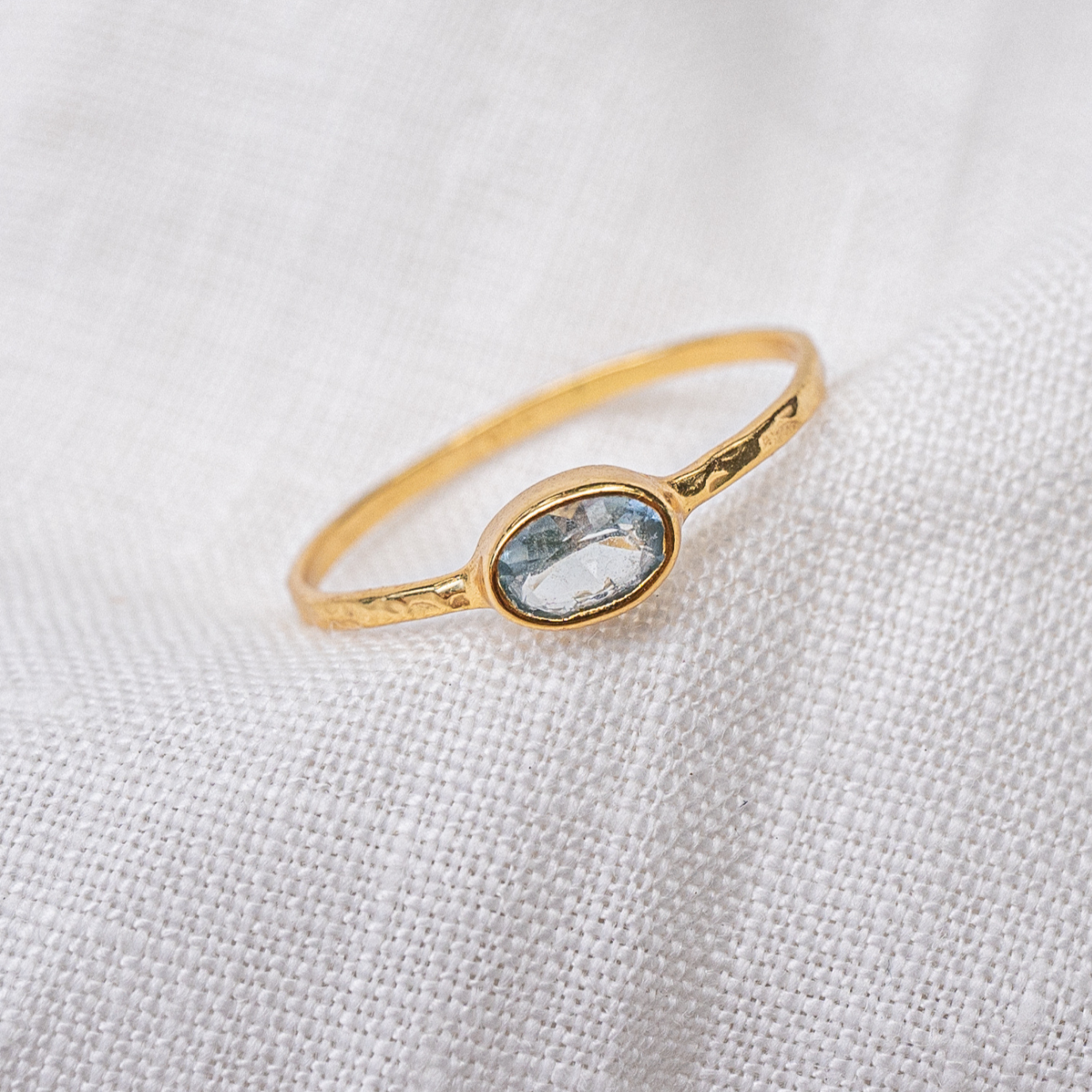 Description: Delicate hammered sized gold ring with blue topaz gemstone